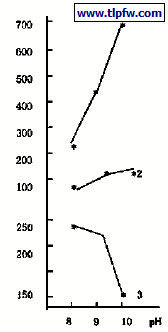 由图2 中的线1 可见,当pH 为8~10 时,pH低则COD 的去除率高;线3 表明pH 高絮凝效果好。在pH = 8 时污泥体积较大,但在过滤时可以得到解决。调节废水的pH 使用石灰较好,它不仅使絮凝沉降速度快,且絮状颗粒大,易于分离。