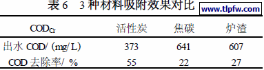 试验采用色层分析柱填装吸附材料。圆柱内经4 厘米,所装吸附材料高40 cm ,流速30 ml/min。试验选用的吸附材料分别为活性炭、焦碳、炉渣。进水是经絮凝后COD 降低为826 mg/ L 的废水(甲) 。吸附效果对比见表6。