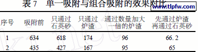 从图2 的1、2 两线可看出,相同数量的炉渣处理不同COD 值的混合废水上清液时,其吸附效果是不同的。待处理水的COD 越高,其去除率也就越高。因此炉渣数量的加大可以弥补吸附率不够高的缺点。但试验表明连续通过不同的吸附材料,其效果比增加单一的过滤材料更好。试验用水是混合废水经絮凝处理后的上清液。情况见表7 所示。石英砂的吸附能力远比同数量的炉渣为差。但依次通过炉渣及石英砂的吸附效果却比单纯加大炉渣数量的吸附效果好。