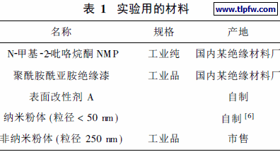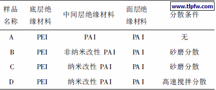 ( 3) 纳米复合绝缘材料的涂覆及试样的制备 纳米复合PA I绝缘漆涂覆方法为: 在直径为1. 0 mm的铜线上预先涂覆一层厚度约为0. 05 mm 左右的改性聚酯亚胺树脂( PE I)薄膜为底层, 再涂覆一层上述改性绝缘漆作为中间层, 烘烤除去NMP溶剂,制备成厚度约为0. 01 mm 左右的纳米粉体/PA I涂层, 再在上面涂覆一层厚度约为0. 02 mm 左右的PA I, 以保护中间层并提高整个漆包线的表面质量。