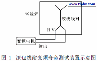 ( 2) 测试方法 将绞线放置在恒温箱中, 温度为90ºc 。绞线一端的两个接头接变频器输出端, 另一端空置。变频器提供的输出频率为20 kHz, 峰压为3 kV, 峰头上升时间为400 ns。根据绞线线对击穿时间来衡量漆包线的耐变频寿命。测试装置如图1所示。