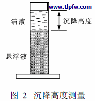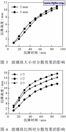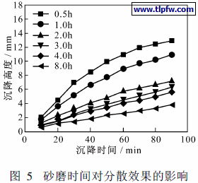 砂磨介质的直径对砂磨分散效果的影响如图3所示。从图3可以看出, 将砂磨介质的直径从5 mm减小到2 mm, 30 m in 后, 沉降高度从4. 8 mm 降低到3. 9mm, 表明分散效果提高。对于理想的球形砂磨介质, 砂磨效果服从以下规律: