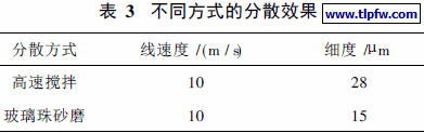 从表3中可以看出, 在同样叶轮线速度下, 玻璃珠砂磨分散的效果比高速搅拌更好。这是因为高速搅拌分散时, 液体以层流方式流动, 通过各液体层彼此滑动产生的剪切力使粉体分散; 而砂磨分散是通过砂磨介质之间的挤压力和剪切力使粉体分散, 砂磨机为微分散过程提供了较大的输入能, 即可利用较小磨球来增加有效区域, 从而达到高粉碎的效果。当叶轮转速V= 10 m / s、叶轮半径r = 20 mm 时, 处于叶轮边缘, 质量为m 的砂磨介质玻璃珠受到的离心力F = mV2/r, 重力为mg, 其受到的离心力是其自身重力的510倍, 离心力这样强有力的作用在砂磨介质上, 使砂磨介质中产生强烈的剪切作用。
