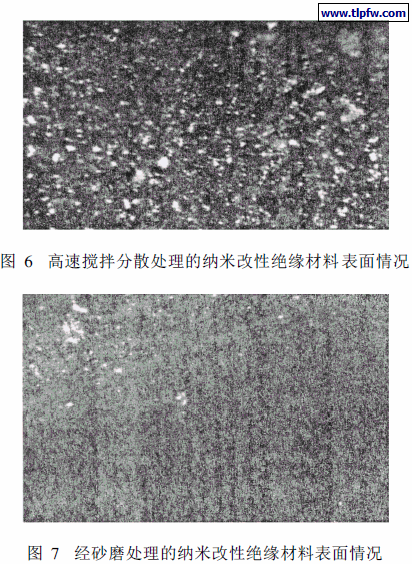 经过适当砂磨后, 由于分散质量的提高, 纳米复合颗粒改性绝缘材料的表面质量大为改观, 结果如图6、图7所示。同时, 绝缘漆耐变频性能也有较大程度的提高, 结果如表4所示。从表4可知, 经高速