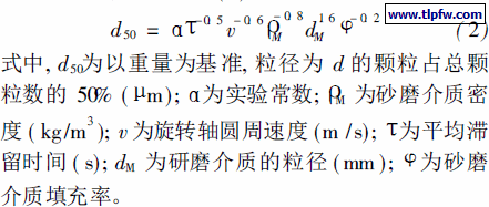 当砂磨介质的比例从1 /3 提高到1 /2时, 分散效果得到提高。但是, 过多地提高砂磨介质的比例, 如砂磨介质比例提高到2 /3后, 反而使分散效果下降, 即在砂磨介质大小r 不变的情况下, 在一定程度上增加砂磨介质所占的比例V, 同样可以提高砂磨效果。但是, 当砂磨介质比例过高时, 砂磨介质堆积较密实, 当叶轮旋转将它们抛出时, 为了彼此穿过就偏离直线距离, 砂磨介质的活动性大大降低, 呈现一种拥挤状态, 而不是强有力的分散作用[ 9] 。T. Pisch用因次解析法对砂磨介质的分散效果进行了总结, 结果如式( 2)所示[ 10] 。
