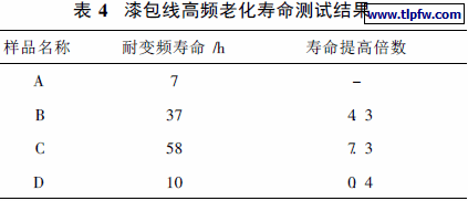 搅拌分散处理制备的纳米改性漆包线耐变频寿命仅为10 h, 而经砂磨分散处理的纳米改性漆包线耐变频寿命达到58 h。