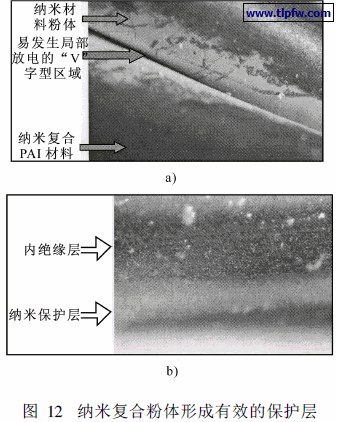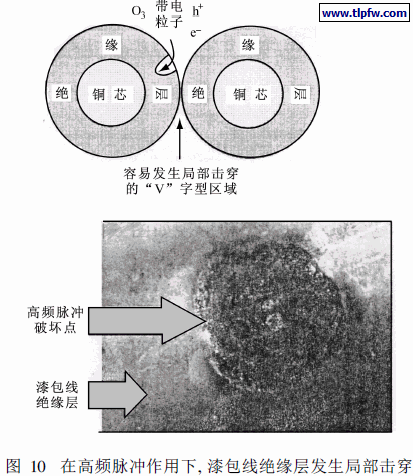 改性漆包线的高频老化寿命测试结果如表4所示。从表4中可以看出, 加入复合颗粒后, 改性漆包线的耐变频寿命有很大提高, 其中, 非纳米复合颗粒使漆包线的耐变频寿命提高4. 3倍, 纳米复合颗粒的改性效果更好, 达到7. 3倍。在变频电机中在高频高压脉冲的作用下, 漆包线之间的! V∀字型区域的空气层发生强烈的局部放电, 使有机绝缘树脂很快被冲刷、腐蚀而变薄, 最后被击穿, 如图10所示。