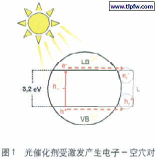 由纳米二氧化钛光催化剂配成涂料,当受紫外光照射时,这种半导体的光催化剂受激发产生电子-空穴对,如图1所示。电子和空穴使周围的氧气和水分子成为活性自由基,而活性自由基能将空气中有机或无机污染物,如氮氧化合物(NOx)、甲醛、苯、二氧化硫等,直接分解成无害的物质,从而达到消除污染、净化空气的目的。