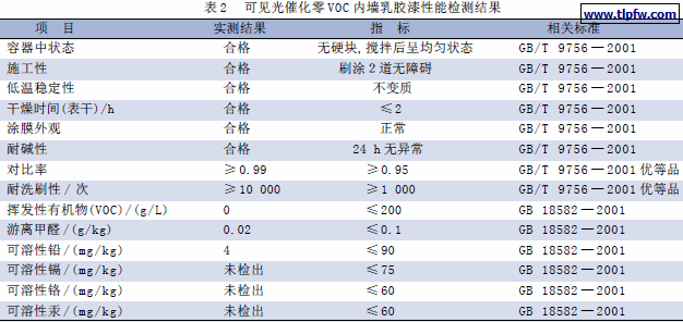 据介绍[3],某一稀土掺杂的纳米锐钛型TiO2光催化剂的杀菌率,对金黄色葡萄球菌6 h 为100%,对大肠杆菌6 h 为100%。纳米TiO2 可见光催化零VOC 内墙乳胶漆具有的降解有毒有害物质、消除异味和抗菌的作用不仅与光催化剂的粒径、浓度和性能有关,而且与照射光的波长分布和照度、环境的湿度等相关。这种可见光催化零VOC 内墙乳胶漆,经上海涂料和颜料质检站测试,结果如表2所示。其不仅是零VOC 产品,而且性能远远高于GB/T 9756 — 2001《合成树脂乳液内墙涂料》中优等品的要求。