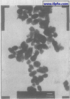 将改性乳胶漆试样适当稀释,超声分散30min 后,用J EM22000EX 透射电子显微镜进行分散性能分析。图1 是经纳米TiO2 改性的内墙乳胶漆的TEM 照片。
