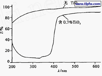 阳光中的紫外线是造成乳胶漆老化的重要因素。紫外线波长介于200 ~ 400 nm 之间,分为UVA、UVB、UVC 三个区段, UVC ( 200 ~ 275nm) 可被同温层的臭氧吸收, 到不了地面。而UVB(280~320 nm) 、UVA (320~400 nm) 能作用于各种材料表面及内部,造成材料老化。紫外线的波长越短,能量越强,对乳胶漆的耐久性危害也就越大。虽然内墙乳胶漆的老化现象较之外墙乳胶漆要轻缓许多,但当室内有较强烈光线影响及照明作用时对内墙乳胶漆的老化作用仍不能忽视。经纳米TiO2 改性的乳胶漆可以散射紫外线,但不反射可见光。对紫外光的屏蔽效果见图2 。