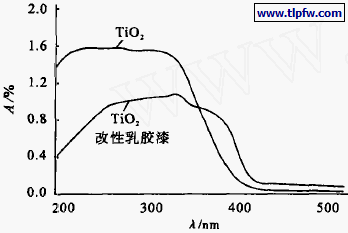 纳米TiO2 在吸收能量高于其禁带宽度的短波光辐射后,产生电子跃迁,价带电子被激发到导带,形成空穴2电子对,并将能量传递给周围的介质,由此可诱发光催化反应,具有光催化能力[5 ] 。图3 显示了纳米TiO2和经纳米TiO2 改性的乳胶漆对波长小于400 nm 的光辐射的吸收情况。在紫外光的有效作用下,纳米TiO2 光催化剂对有机物有很强的降解作用,能与空气中的甲醛、氨气、苯等有害气体发生反应,将它们转化为无毒化合物,对环境空气起到极好的净化作用,并能避免二次污染的发生。由图2 、图3 可见,经纳米TiO2 改性的乳胶漆对紫外光具有优良的吸收性能,结合纳米TiO2 的光催化性能,此种改性乳胶漆对甲醛等多种有毒有害气体必具一定的净化效果,具体性能指标有待进一步实验论证。