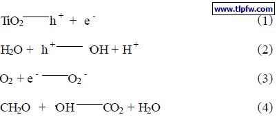 纳米TiO2 的灭菌机理在于作为N 型半导体光催化材料,其电子结构特点为一个满的价带和一个空的导带。在紫外光照射条件下,当电子能量达到或超过其带隙能(3. 2 eV) 时,电子就可从价带激发到导带,同时在价带产生相应的空穴,即生成电子- 空穴对。电子和空穴与空气中的H2O 和O2 作用能产生具有很强活性的·OH 和·O2- ,他们能将大部分有机物氧化分解成H2O 和CO2 ,主要反应如(1) ~(4) 式。