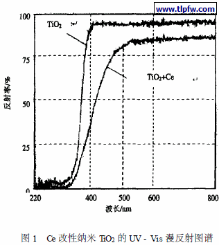 (1) Ce4 + 改性纳米TiO2 可以使纳米TiO2 的紫外可见光谱吸收阀值从400 nm 红移到500 nm ,从而提高纳米TiO2 的光催化性能,Ag + 改性纳米TiO2 可以大幅度提高抑菌性能。