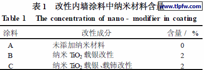 取纳米TiO2 、自制纳米载银及纳米载银、载铈几种无机纳米材料制成A、B、C 三种内墙涂料,其中Ag + ∶Ce4 + 按10∶1 的比例复合配制。在涂料的制作过程中均采用了超声波分散与研磨分散相结合的方法。