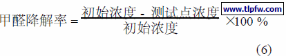 在面积为790 mm ×800 mm 的玻璃板上喷涂待测涂料,成膜干燥后放入反应箱底部和四周,盖上顶面玻璃并用凡士林密封。从反应箱顶部的小孔向内注入初始浓度为2. 5 mg/ m3 的甲醛气体,然后用玻璃盖盖上小孔并用凡士林密封,这时启动电风扇让气体流通均匀,间隔1 h 测试一次甲醛浓度值。最后按照式(6) 计算出甲醛降解率。