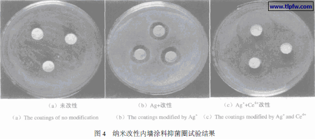 纳米TiO2 载铈载银复合纳米材料经过超声波预分散后,加入到普通丙烯酸内墙涂料中,制成纳米改性内墙涂料。然后检测纳米改性涂料的抑菌性能和甲醛降解性能。