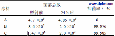 同样用表1 改性配方制成的A、B、C 三种内墙涂料,采用2. 1. 2 所述方法检测三种涂料对大肠杆菌和金黄色葡萄球组成的混和菌的抑菌率,并按照式(5) 计算出抑菌率,改性涂料抑菌效果见表2。
