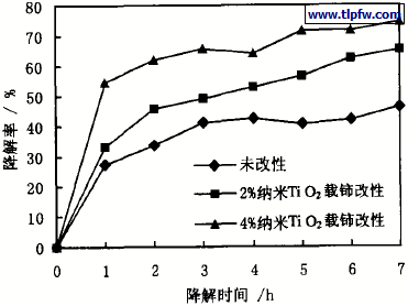 制备未改性、2 %纳米TiO2 载铈改性和4 %纳米TiO2 载铈改性三种内墙涂料,按照2. 2 所述的检测方法,分别将三种涂料涂于玻璃板上,待涂料干后将其放到反应箱中,通入甲醛,待反应箱中气体稳定之后测试甲醛初始浓度,然后用40 W的日光灯进行光照。测试各反应时间点的甲醛浓度,然后按照式(6)计算出各个时间点的甲醛降解率。经过8 h 光照射后三种涂料的甲醛降解结果如图5 所示。