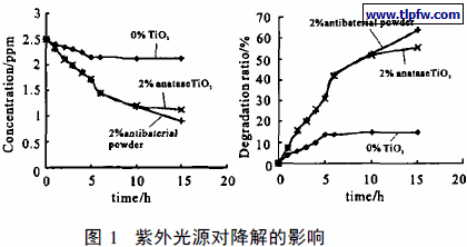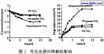 ( 2)紫外光为催化光源的条件下, 用锐钛型纳米T iO2 和抗菌粉制备的相同配比的改性乳胶漆光催化降解甲醛效果差不多, 这是由于它们在紫外光区吸收光子能量的能力无明显差异引起的。