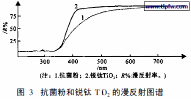 第1个阶段是以20W 的紫外灯为催化光源,甲醛初始浓度均为2. 5 ppm, 实验具体方案按1. 5实施。从实验结果可看出, 用锐钛型纳米T iO2、抗菌粉配制的改性乳胶漆和未改性的乳胶漆均能不同程度的降解甲醛, 锐钛型纳米T iO2、抗菌粉配制的改性乳胶漆比未改性的乳胶漆的甲醛降解程度大得多。用纳米T iO2、抗菌粉改性的乳胶漆对甲醛的降解效果没有特别明显的差别, 用紫外光光度计检测锐钛型纳米T iO2 和抗菌粉的漫反射光谱(见图3),可以发现, 在紫外光区, 它们吸收光的能力是一致的, 说明它们利用紫外光的能力没明显区别。