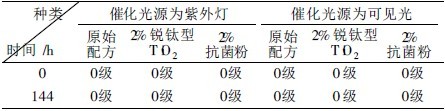 紫外线是引起涂料老化的根本原因之一, 因为紫外线可引起涂层的主要成膜物质链断裂, 形成活泼的游离基, 游离基进一步引发整个成膜物质的分子链发生降解。为了考察纳米T iO2 改性乳胶漆在光催化净化空气的同时, 涂膜本身是否因光催化加快老化过程。作者把已经完成了光催化实验的乳胶漆再进行老化实验, 以判断涂膜是否因光催化而加快树脂老化。为了获得有效数据, 把光催化实验时间延长到144 h, 老化实验结果见表1。