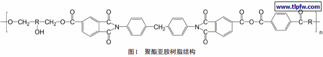 聚酯亚胺漆包线漆于20 世纪60 年代由德国BECK公司通过酰亚胺基团改性聚酯获得,在国际上是180 级漆的主要品种。该产品具有较好的电气性能和机械强度,且耐热冲击和耐软化击穿,在180级及以上复合涂层漆包线制造中作为底漆涂层的主要材料,在耐高温和耐氟利昂的电机电器中得到广泛应用。我国于80 年代从德国BECK和意大利SIVA引进聚酯亚胺漆制造技术,李强军等[3]基于高分子链适度交联理论,用二元酯、乙二醇和塞克通过酯交换得到两端含羟基的聚酯树脂,再进行亚胺化生成聚酯亚胺树脂,其结构如图1 所示。结果表明,塞克的使用提高了漆的耐热性能,增强了漆膜的强韧性;引入亚胺基团显著改善了漆膜的强度、弹性、耐热冲击和软化击穿性能。卢军彩等[4]通过将耐热的亚胺环氧引入到传统聚酯亚胺中,改性获得了一种H级不饱和聚酯亚胺无溶剂浸渍漆,提高了漆膜的高温粘结力。国产的不饱和聚酯亚胺无溶剂浸渍漆应用在风力发电机上其介质损耗低、电气强度高、抗潮湿防电晕效果好,绝缘状况稳定,发展前景良好[5]。