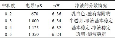 (3) 在保证漆液分散的稳定性及其电导大于800μS 的前提下,应尽量选择较低的中和度。