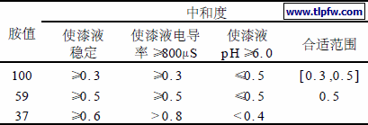根据实验确定出不同胺值树脂的合适中和度范围如表4 。