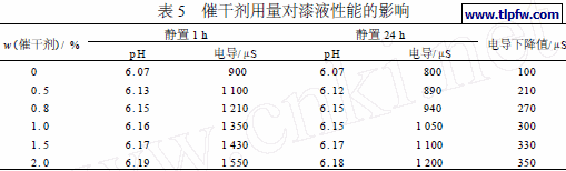 (2) 降低电泳漆粒子之间的静电斥力。从而引起漆液产生部分絮凝沉降,导致电导下降。因此,从漆液性能考虑,催干剂的加入量不宜太多,一般不超过0. 02 ;另外,漆液在使用之前应进行充分搅拌。