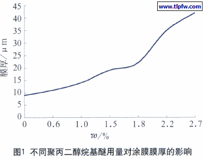 阴极电泳涂料工作液试验过程中,在电泳电压、槽温、极比、极间距、电泳时间等工作条件不变情况下,我们试验了聚丙二醇烷基醚不同的用量,其对电泳涂料成膜性能影响如图1。