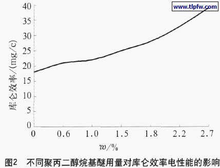 由于聚丙二醇烷基醚能增加成膜物质的移动性,因此,它对产品的库仑效率电性能的影响是显而易见的。图2就是不同用量的聚丙二醇烷基醚对电泳产品库仑效率的影响。