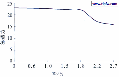 由图3可知,当聚丙二醇烷基醚加入量小于1.8%时,阴极电泳涂料产品的泳透力变化不明显,而当加入量大于1.8%时,电泳涂料产品泳透力急剧下降。因此,我们在聚丙二醇烷基醚应用过程中用量一般保持1.5%~1.8%,以保证阴极电泳涂料产品的高泳透力。