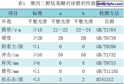 由表1试验结果可以看出,添加聚丙二醇烷基醚的阴极电泳涂料产品的杯突及冲击性能明显得到加强,硬度等其他性能一致。