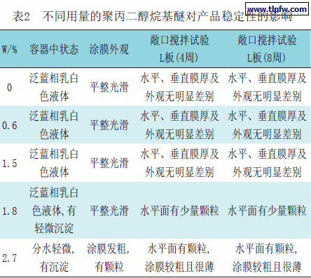 将聚丙二醇烷基醚不同用量的试验产品放在(45±2)℃恒温干燥箱中,作贮存稳定性试验,然后检查乳液状态,同时按标准制板,检查涂膜外观。将上述系列试验工作液作敞口搅拌稳定性试验,结果见