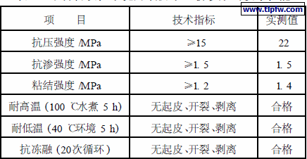 聚合物改性水泥外墙防水干粉砂浆易于形成一层具有高强度、防水抗渗的厚质体,可以抑制基底泛碱和水气侵蚀。由于水泥还具有一定的吸湿性,可有效地防止防水干粉砂浆与基质、防水干粉砂浆与涂料界面处水汽的聚集,克服毛细管压力破坏所引起的剥离、起泡、脱皮等弊病,从而确保涂料装饰长期的使用效果。与普通涂料腻子相比,聚合物改性水泥外墙防水干粉砂浆可大幅度提高材料的粘结强度和防水抗渗性能。经国家建材测试中心检测,其主要技术性能指标见表2。