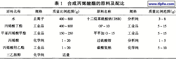 根据表1配比,取一定量的去离子水加入非离子型乳化剂和阴离子型乳化剂,用电动搅拌器搅拌5min,边搅拌边加入单体丙烯酸丁酯和甲基丙烯酸甲酯,乳化搅拌15rain~20min,再加入功能单体丙烯酸、丙烯酸羟乙酯等搅拌5min以后加入一定量的碳酸氢钠,搅拌均匀后备用.