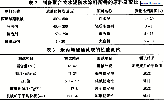 (1)采用单体丙烯酸丁酯和甲基丙烯酸甲酯以及:功能单体丙烯酸、丙烯酸羟乙酯,以十二烷基硫酸钠、OP一10和平平加的复合乳化剂为乳化体系,通:过控制聚合物乳液玻璃化温度合成的丙烯酸乳液与水泥复合配比后,可以制备出性能优良的聚合物:水泥防水涂料.