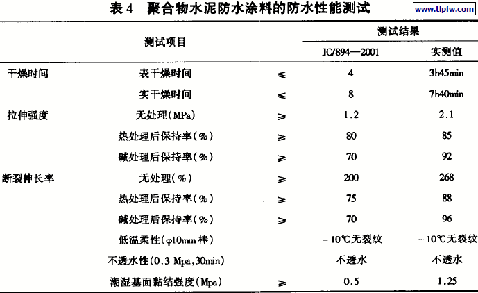 聚合物水泥防水涂料的防水性能测试结果见表4.