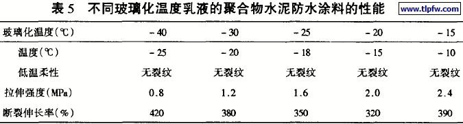 考虑到聚合物水泥防水涂料必须具备良好的弹塑性、延伸率,来抵抗建筑结构因沉降、位移、干缩、热胀冷缩等造成的变形,聚合物水泥防水涂料的聚合物乳液的较佳玻璃化温度应选取一20ºc~一15 ºc.