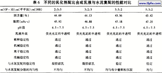 采用了十二烷基苯磺酸钠(DSB)为阴离子乳化剂、烷基酚聚氧乙烯醚(OP一10)和平平加为非离子乳化剂,将合成的乳液按照相同的液粉比与水泥复配,进行性能对比,结果见表6.