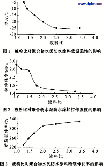 (1)液粉比对聚合物水泥防水涂料低温柔性的影响(见图1)