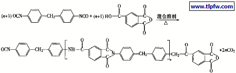 以偏苯三酸酐(TMA) 和二异氰酸酯(MDI) 为原料,在N – 甲基吡咯烷酮(NMP) 和二甲苯混合液中进行缩合反应,适时添加各种助剂,生成聚酰胺酰亚胺。反应机理如下: