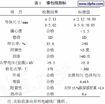 外观与机械杂质,均符合要求;固含量,28 %;粘度,750mPa·s。样品为200 度级聚酯亚胺/ 聚酰胺酰亚胺复合漆包铜扁线,型号Q ( ZY/ XY) B – 2/ 200 ,规格:2. 12mm ×5. 0mm。采用GB/ T7095. 6 – 1995 ,检测结果见表1。