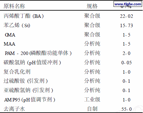 第一步核聚合物乳液的合成:向装有温度计、搅拌装置、回流冷却器及滴液漏斗的四口瓶中加入复合乳化剂、去离子水、pH值缓冲剂,搅拌融解均匀后,加入50%混合单体(BA、St、GMA)作为核层单体,搅拌通氮30 min后升温至60 ℃, 一次性加入1 /2的引发剂,温度上升,待体系温度回落至60 ℃,得到核聚合物乳液。第二步核壳聚合物乳液的合成:在核聚合物乳液基础上,开始滴加混合均匀的剩余单体(BA、St、MAA、PAM – 200) 、引发剂、乳化剂, 1 h滴完,继续保温215 h,得到核壳聚合物乳液。降温到35 ℃以下,调节pH值为7~8,用100目的钢丝网过滤,出料。