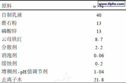在高速分散缸中加入去离子水, 依次加入分散剂(BYK192) 、缓蚀剂(15%亚硝酸钠溶液) 、颜填料(磷酸锌、滑石粉、云母铁红) ,分散搅拌均匀后用锥形磨研磨,直至细度达到30μm以下,制得浆料。然后在低速搅拌下将乳液加入浆料中,加入成膜助剂、增稠剂、pH值调节剂、消泡剂(BYK19)混合搅拌均匀,过滤出料。水性涂料配方如表2所示。