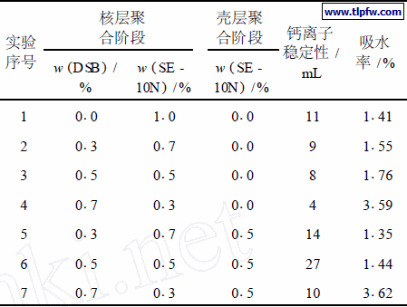 由表4可知,把DSB和SE – 10N复配使用,随着反应型乳化剂SE – 10N所占比例增大,乳液钙离子稳定性变好,尤其是在滴加壳层单体同时补加015%的SE – 10N能使乳液的钙离子稳定性明显提高;这是因为含非离子型乳化剂的SE – 10N集中在壳层,更大效率地发挥了其对乳胶粒的稳定作用。漆膜的吸水率随SE – 10N含量增加有减小趋势,因为随着可聚合型乳化剂比例的增加,减少了乳化剂分子向漆膜表面的迁移,从而降低了漆膜的吸水率,提高了耐水性。综合考虑,在方案6的配比下乳液和漆膜的性能较好,从而确定乳化剂总量为单体总量的1.5% ,核层为DSB (0.5% ) /SE – 10N (0.5% ) ,壳层