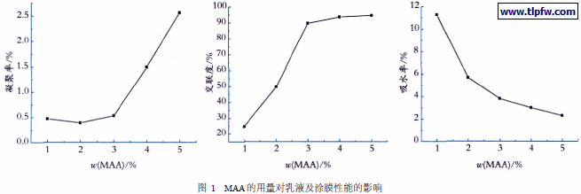 本实验采用分阶段加入交联单体GMA /MAA的方法,将交联官能团固定在核壳结构不同的层中,因为核壳结构乳胶粒堆积成膜过程为:随着水分不断蒸发,粒子紧密接触,水分继续蒸发,导致粒子变形、塌陷,各层聚合物由于扩散和粘性流动而相互混合,这样分布在不同层中的环氧基和羧基相遇,发生交联反应,从而提高漆膜的交联度和致密性[ 6 ]。实验采用核壳质量比为1∶1,在保证两种官能团比例1∶1的情况下,考察交联单体用量变化(以MAA为例)对乳液聚合稳定性、漆膜的交联度、耐水性的影响。结果如图1所示。
