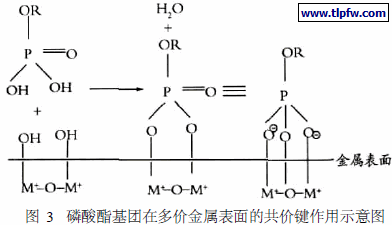 为了改善涂层对金属表面的湿附着力,提高乳液的稳定性,选择了一种磷酸酯功能单体PAM – 200,它是磷酸单酯、磷酸双酯(图2)和少量磷酸单体的混合物,磷酸酯单体的功能性在于:磷羟基与金属表面有较强的螯合作用,从而与多价金属作用形成络合物,以共价键的形式把聚合物牢固地连接到金属基材上,增强乳胶漆在各种金属基材上的附着力。其作用机理如图3所示。