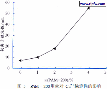 表5中的闪蚀时间是指乳液涂刷完毕至铁板表面出现淡黄色锈迹的时间。随着PAM – 200用量增加,闪蚀时间有所延长,当用量增加至4%时,完全抑制了闪蚀现象。这是由于磷酸酯功能单体与金属基材的共价键作用,提高了漆膜的湿态附着力,从而对闪蚀有一定的阻碍作用。这就证明,在AMP- 95将pH值调节至8的条件下,加入4%的PAM – 200可以完全抑制金属的闪蚀。功能单体PAM – 200加入量对Ca2 +稳定性的影响如图5所示。
